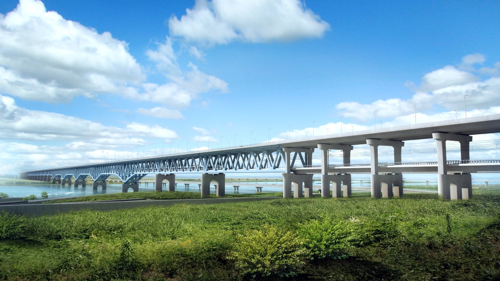 焦洛平高鐵洛陽黃河公鐵大橋全長13.36公里,主橋長2061米,橋跨布置為(8×108)m連續梁+(128+4×180+128)m連續梁+(2-108)m簡支梁,采用雙層公鐵兩用結構。